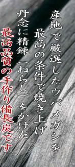 1. 湿度が高いときには湿気を吸収し、空気が乾燥してくると内部にたまった水分を放出しま す。このため備長炭を置いた空間は理想的な湿度を保てます。 2. ホルムアルデヒドに代表される有害な化学物質を吸着する機能があります。 3. 水道水中に含まれる塩素やトリハロメタン等の有害物質を除去します。さらに備長炭 の中からカリウム、ナトリウムなどのミネラル分が溶け出し良質のミネラル水となります。 水の分子を小さくし、人にやさしく、やわらかい水になります。 4. 備長炭はモノを内部から暖める遠赤外線を放出します。温度が上がるほど放射量は多く なり食べ物をおいしく焼くことができます。 5. 空気中のマイナスイオンを増加させる作用があり、大気を正常な環境に戻します。 6. 食物から発生する老化ホルモン(エチレンガス)を吸着する作用があり野菜など食物の 鮮度を維持する効果があります。 7. 備長炭は高温均一に炭化されているため、コンピューターや家電製品などから発生される 電磁波遮断効果が期待されます。 注)全体を覆う(シールド化)ことにより有効 その他、まだまだ知られざる驚異のパワーが!! もっと詳しく 「木炭豆辞典」